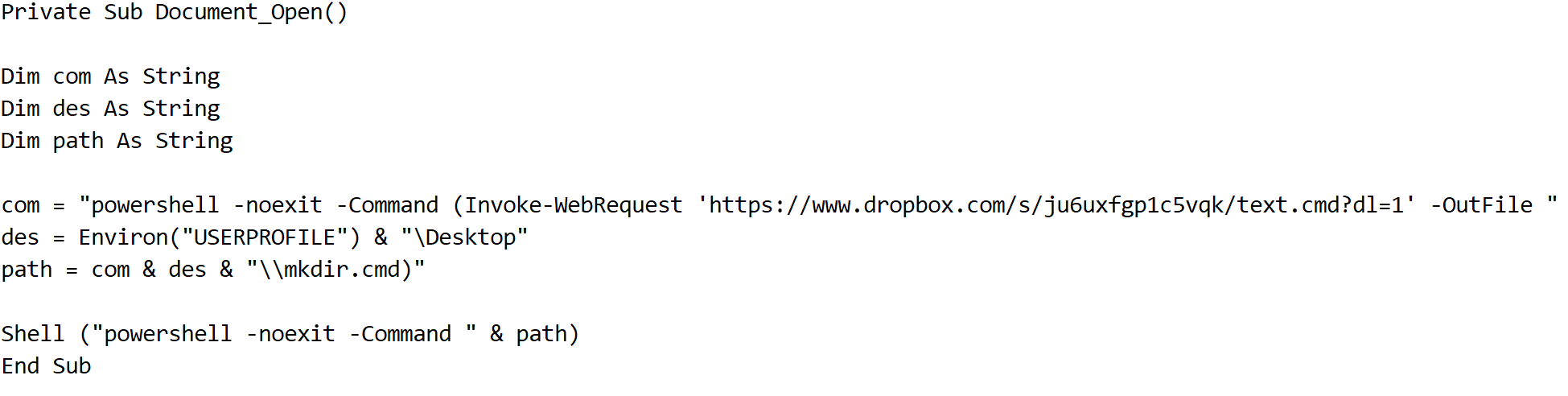 So, lets enhance things a little and create some powershell code within the macro to download a .cmd file from dropbox. The .cmd contains one line to create a new folder (mkdir):