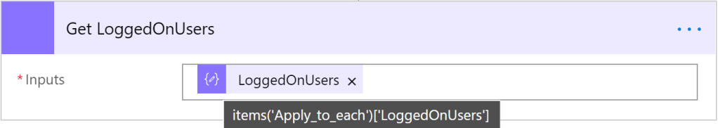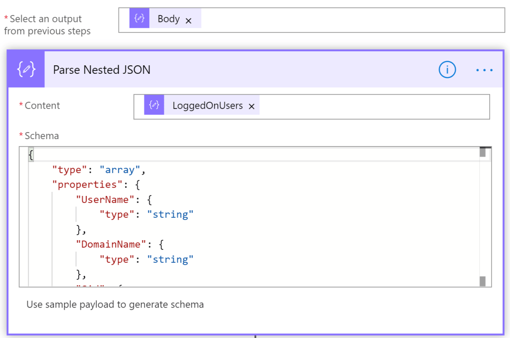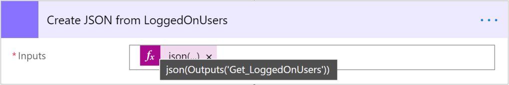 With the ‘JSON Compose’ action, we can now select “LoggedOnUsers”: