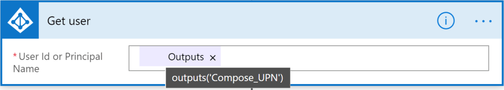 As you can see in the tool tip, we take the result from before and select the property UserName (from the first entry of the array), then we add (hardcoded) the UPN suffix.