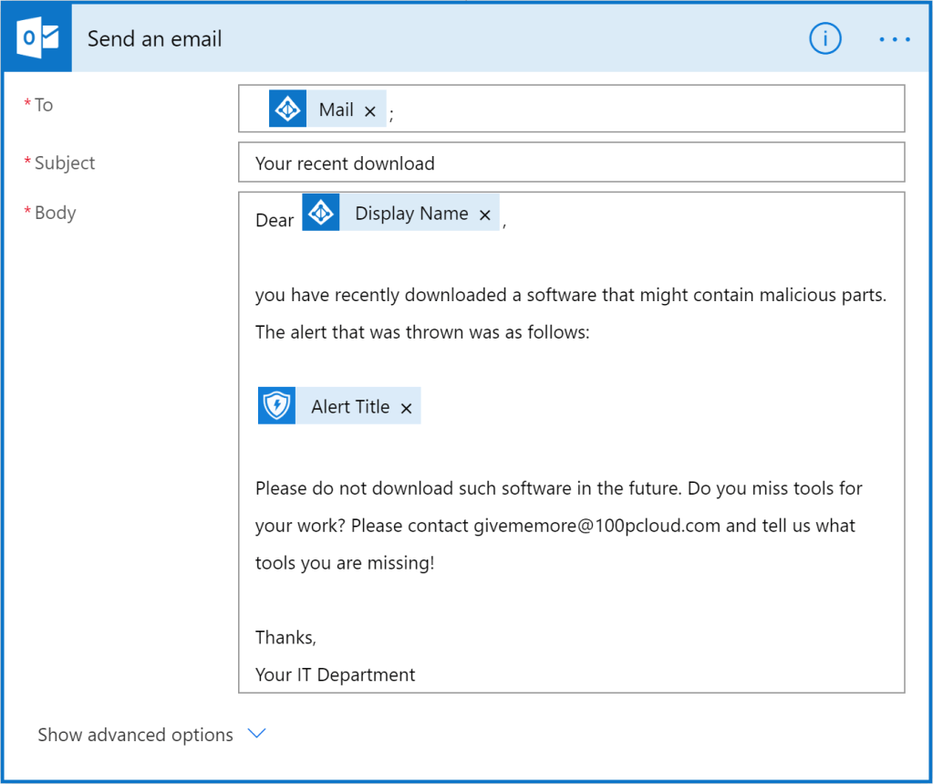 The need to automate user communication based on MDATP alerts exists. The available possibilities with flow are quite complex at the moment. Things would be much easier, if MDATP would return the UserName associated with an alert by advanced hunting (and in UPN format ;-)). Another option would be to add a “send email” option in the ‘custom detection’ actions.