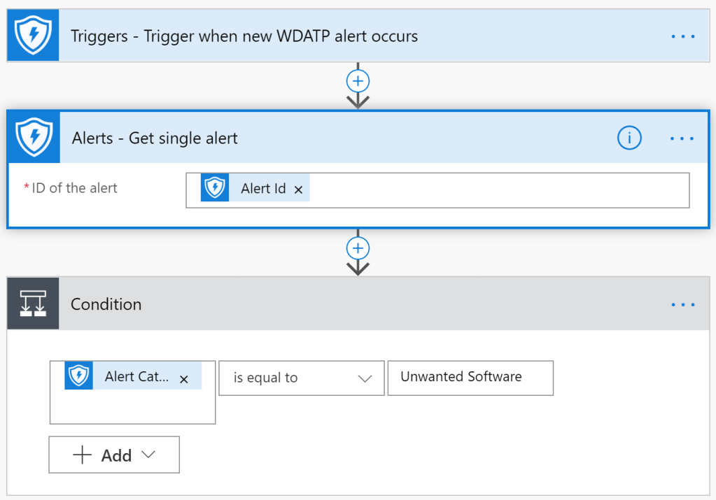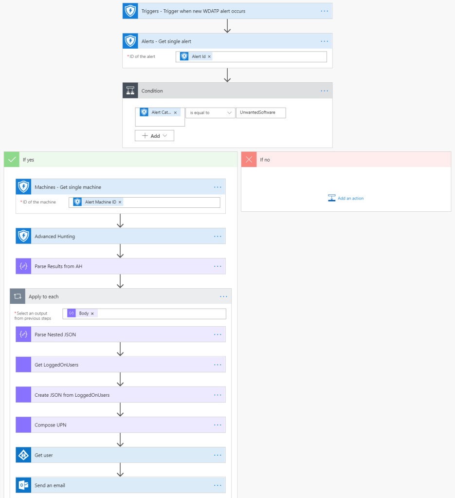 From then on we are only interested in the “Yes” case of the condition – meaning: only if the alert has a category of “Unwanted Software”, proceed, otherwise, grab a coffee.