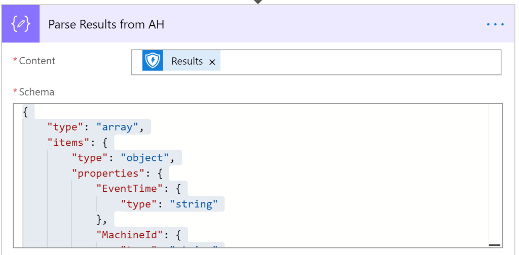 To get the necessary schema, you can run the flow and take the result of the Advanced Hunting Query and then click on “Use sample payload to generate schema”. However, here is the schema for you to copy’n’paste: