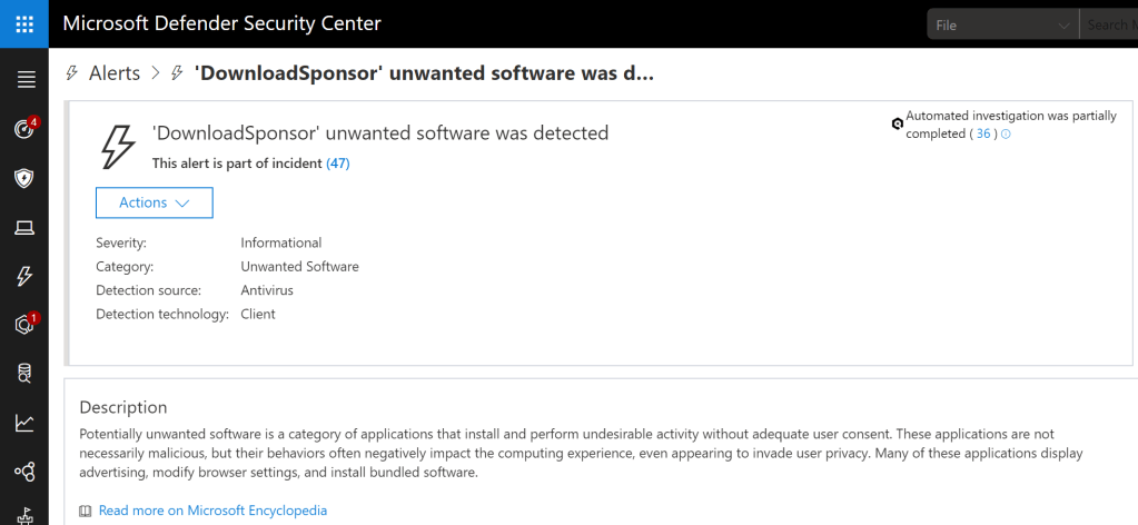If you enable PUA detection on the client (via PowerShell or Intune), MDATP throws alerts when PUA is downloaded by the user: