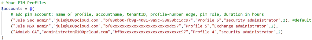 Open PimMeNow.ps1 with the editor of your choice, e.g. Visual Studio Code. At the top of the script, you need to adjust your profile settings. Provide
