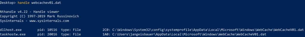 The most important file here is the “WebCacheV01.dat” database. The problem here is that this database is locked, and you cannot easily kill this process: