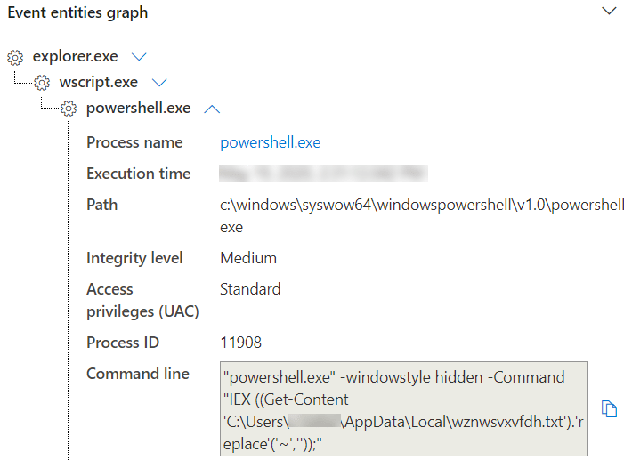 Which – among others- returned an entry for a .js file which was downloaded. I wasn’t able to grab that .js file, but in the timeline of the Machine in Microsoft Defender ATP (MDATP), I saw the following entry, right after the ASR-Audit: