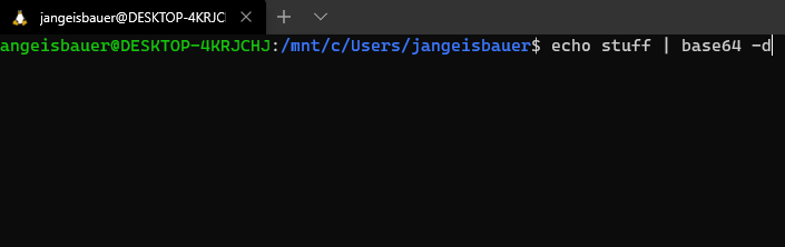 Better – not good. So next, I had to decode the base64 string that we found in the first line of the ~-free txt file. The most convenient way for me to do that is in Terminal/WSL Ubuntu: