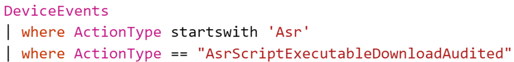 In an environment that is auditing Attack Surface Reduction rules, I ran the following Microsoft Threat Protection (MTP) Query: