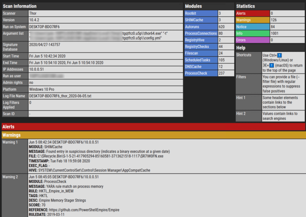 In the report, you will see all the matches THOR found with some additional information from the rules.