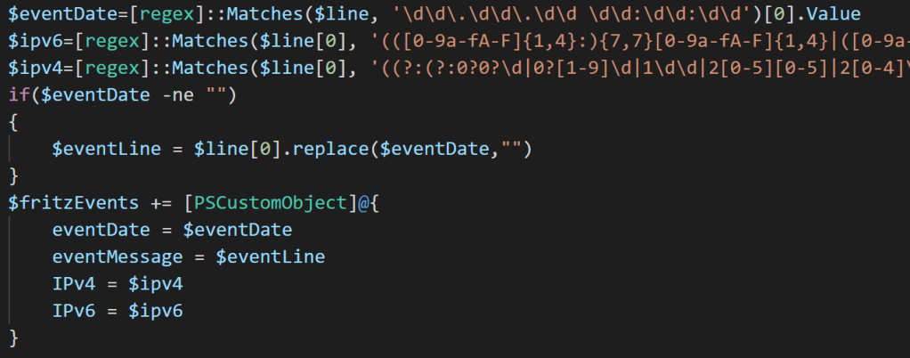 The next important part of the script then extracts the IP addresses and dates from the event message and matches it to the field names in Sentinel: