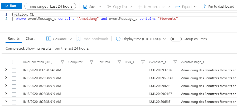 As part of a bigger blog post coming up here soon, I have created a PowerShell script that connects to your FritzBox, reads its event logs, extracts the event time, IP addresses and event messages and sends everything to Azure Sentinel for comfortable hunting and alerting and basically everything else Sentinel offers.
