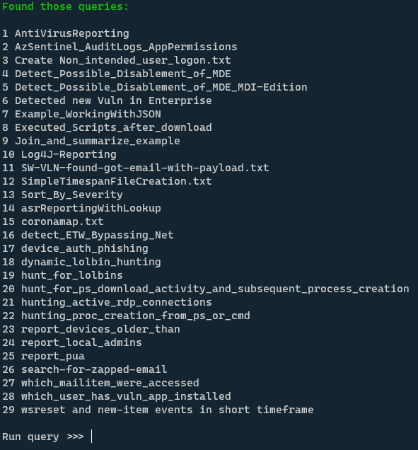 You can again specify multiple tenants here and then specify the URL of a GitHub repo, that holds KQL queries. Next, gundog will parse this repo and display you all the KQL files it found there: