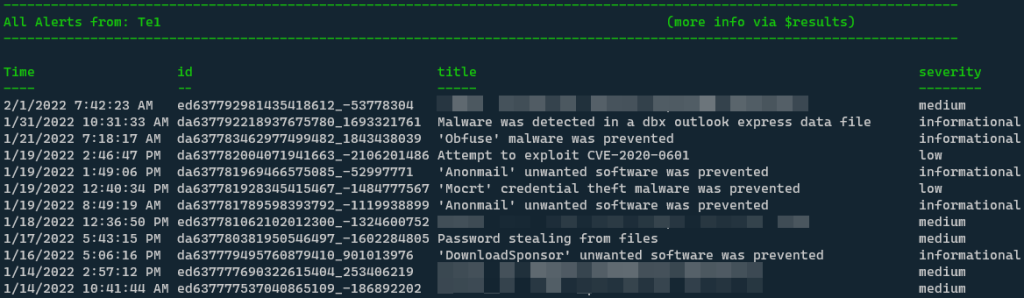 This lists all the tenants from your config file (actually the first 3 letters of the tenant’s name). Next you are prompted on for how long you want to look back to display all the alerts of this tenant: