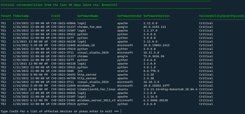 This will display all the critical vulnerabilities of the specified tenants (See tenant column on the left). You are then asked to specify a CveId to receive a list of all associated devices.