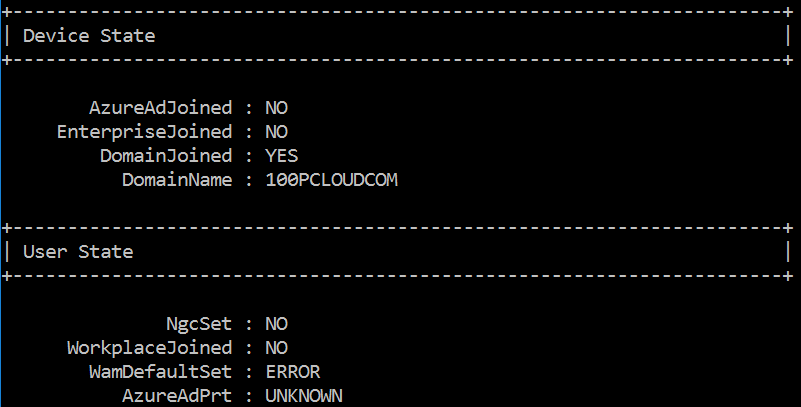 First, let’s get an overview of today’s authentication possibilities. A Windows 10 Computer could be standalone, domain joined, hybrid joined or AAD joined. To find out about the status of a computer, you can do a DSREGCMD /STATUS: