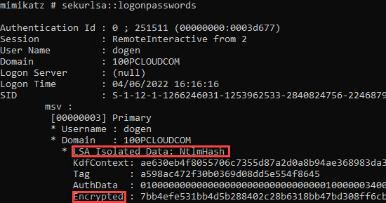 If enabled, mimikatz cannot access the secrets anymore since they are stored in the isolated LsassIso process: