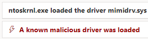 Here is another great alert, which recognizes that the mimikatz driver was loaded (Thats the reaction of MDE to the !+ command in mimikatz):