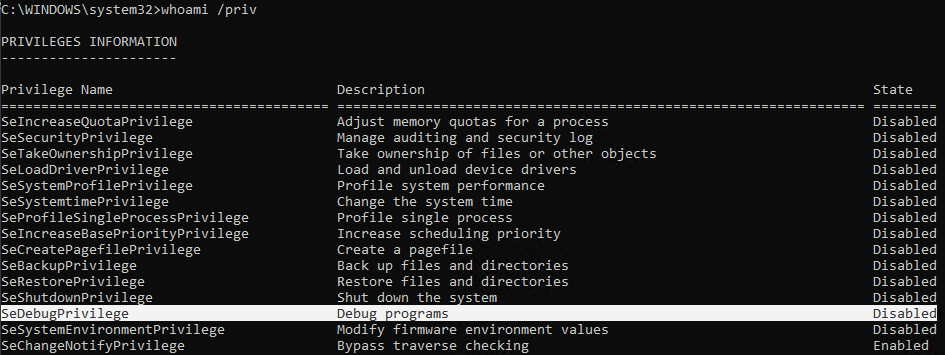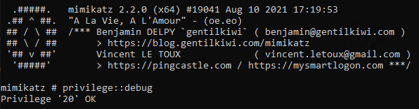 If you now provide privilege::debug to the mimikatz cmd, the privilege table will change accordingly: