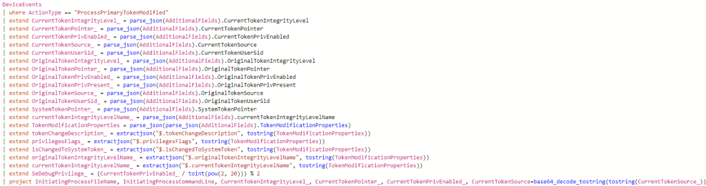 The most important part of this query (second last line) in which we are translating a decimal value into a binary value and then looking for the 20th bit, is coming from Ruben Bouman in his article about token privileges.