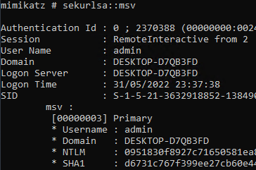 Loging on with a local Windows account by providing a username/password gives us the possibility to read the NTLM hash of the password from memory: