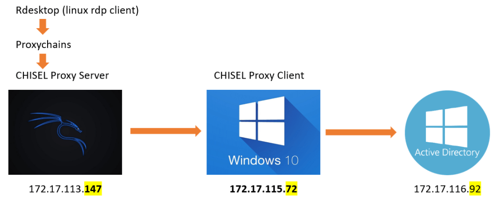Now we are all set – the channel from our attacker machine to the first hop is established. Let’s use it now. Therefore, we need another tool called proxychains. Proxychains redirects all network traffic from a given tool on our Kali box through the proxy tunnel. Let’s use rdesktop as an example: