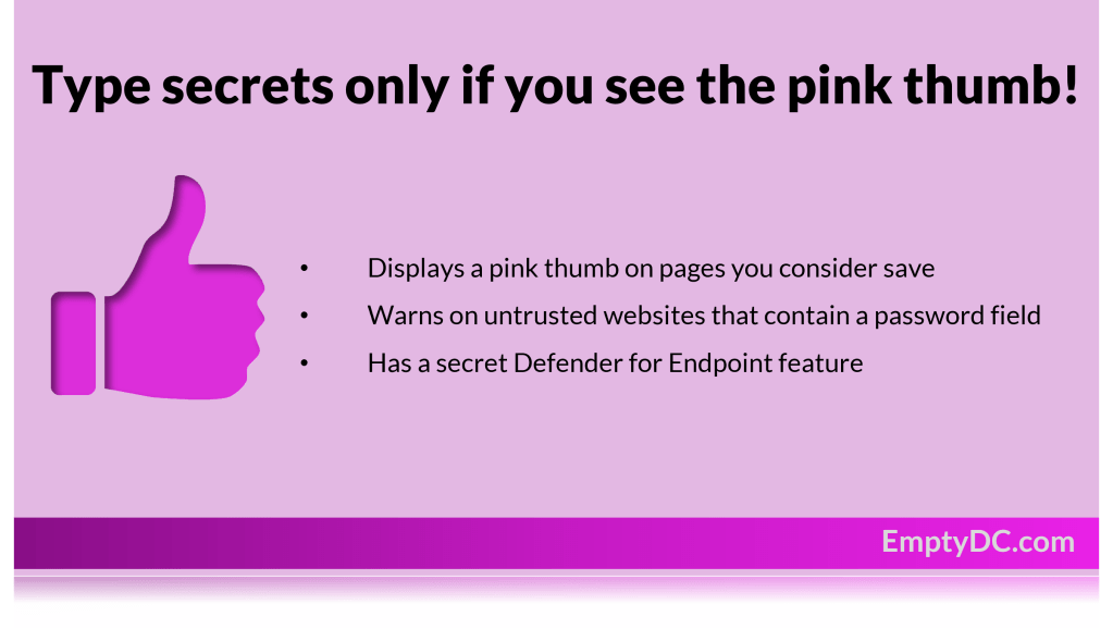The initial idea from 2021 of showing a pink thumb next to the browser’s address bar whenever the user browsed to a website that was considered ‘trusted’, was discussed on Twitter among Jan Bakker and others. Troy Hunt rightly pointed out that with that approach a user must watch out for an indicator (pink thumb) that is either present (yes, you can type your creds now) or absent. Especially, the latter is difficult for some users, I guess – and even more advanced users, like myself, would not always recognize that this indicator is missing.